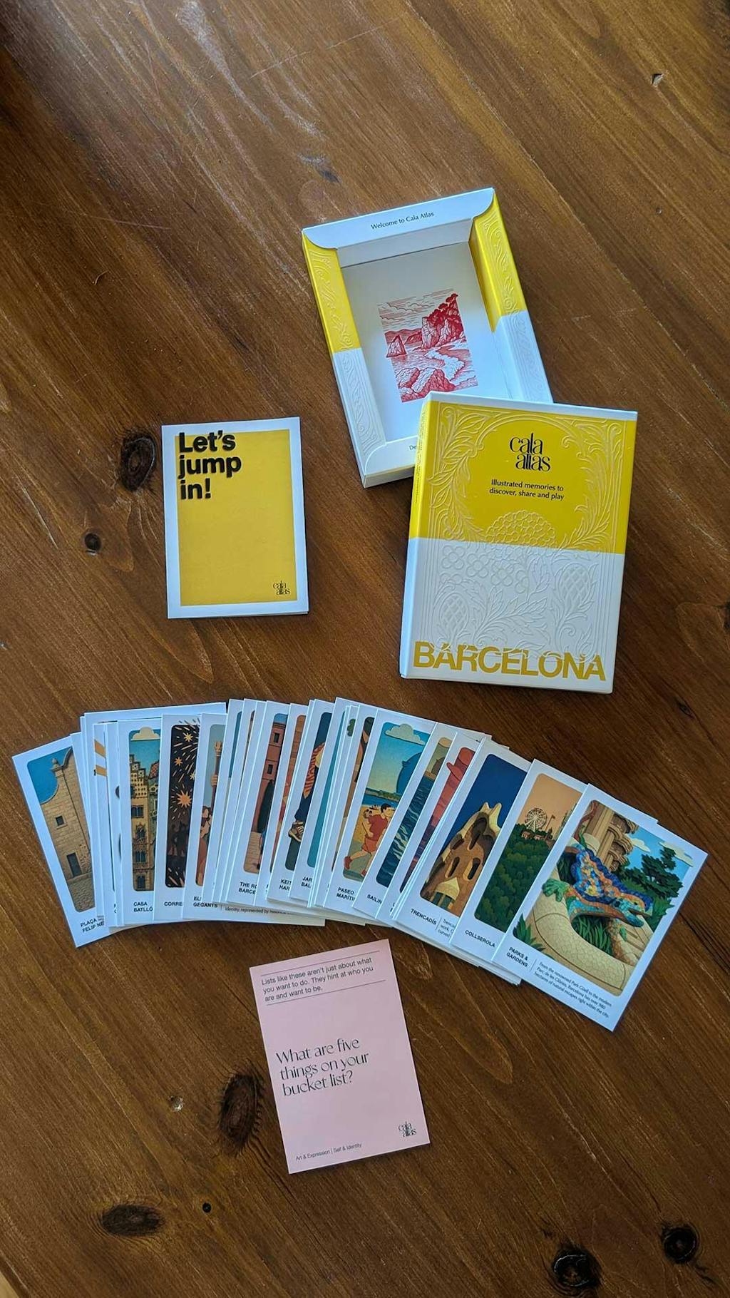 Yellow and white packaging of the Cala Atlas Barcelona Story Deck with a partially revealed illustrated Casa Batlló card