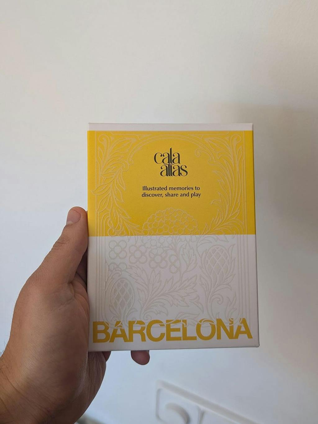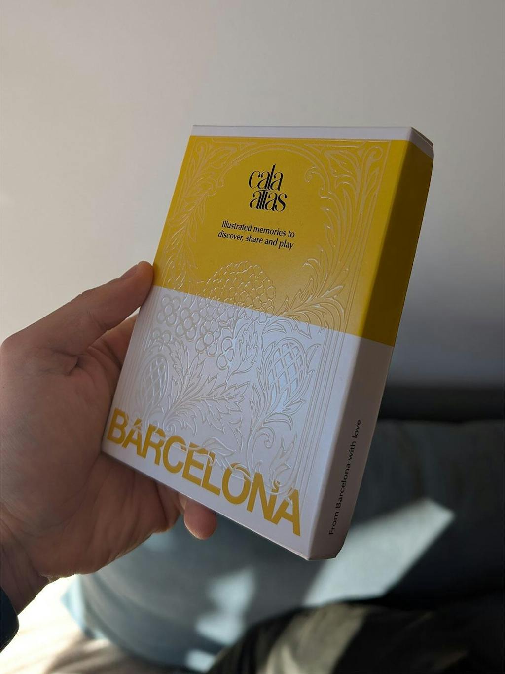 Hands holding the Cala Atlas Barcelona Story Deck gift box, showing the yellow and white embossed packaging