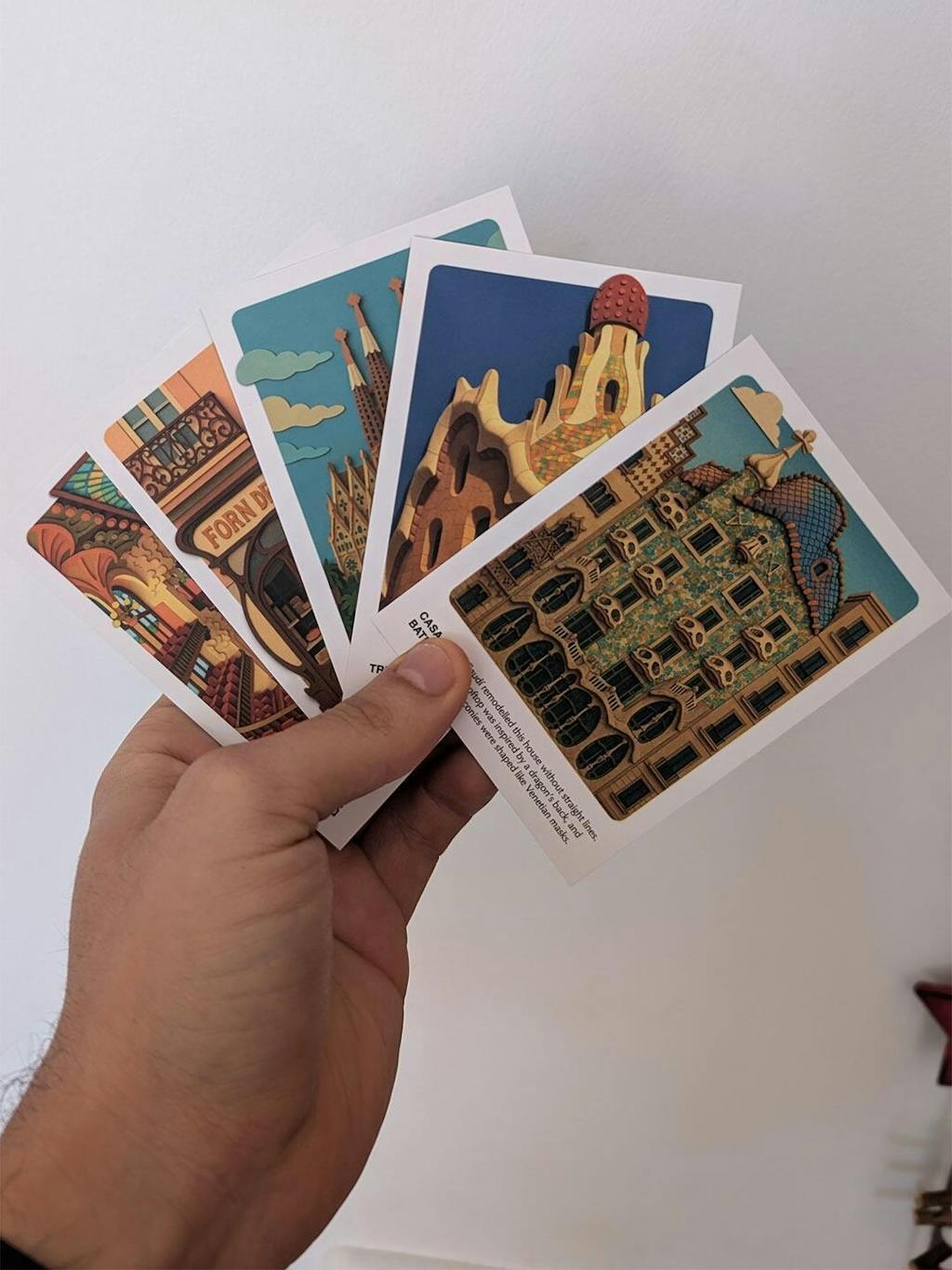 The deck consists of 30 cards divided into 6 themes. Each card is double-sided: one side features an illustrated story about Barcelona, something curious or rarely seen. The other offers a reflective question that turns the deck into a conversation game.
