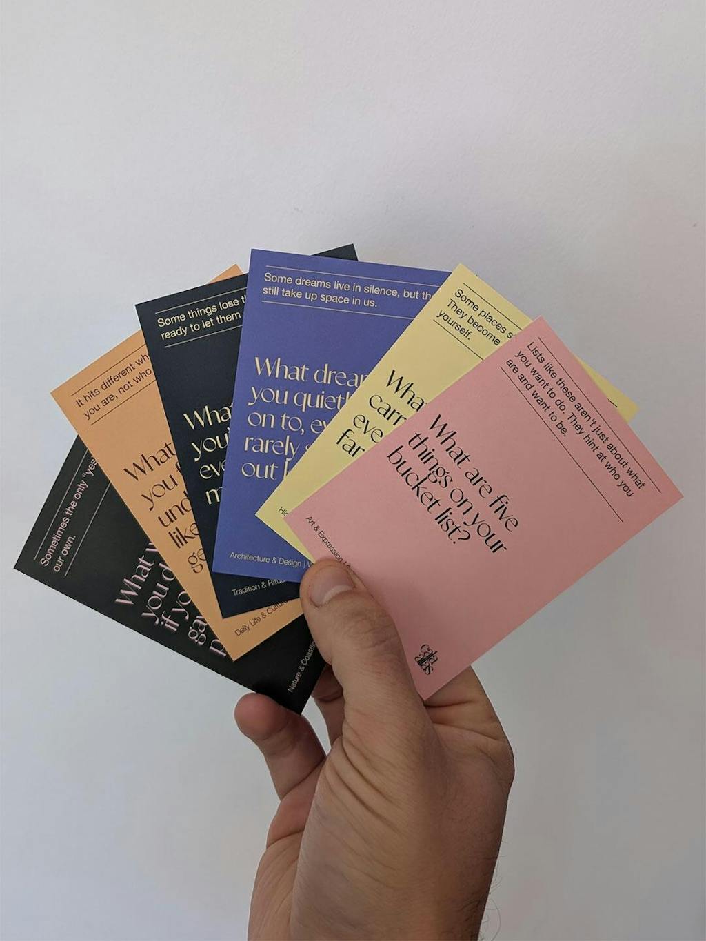 From quiet moments on your own to conversations with loved ones, the reflective questions invite connection. Covering themes from work and aspirations to self and emotions, the deck can turn into a conversation game for personal reflection or for sharing with others.